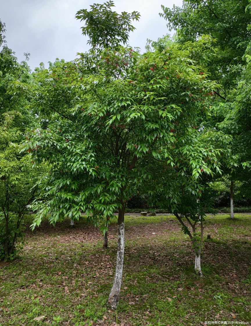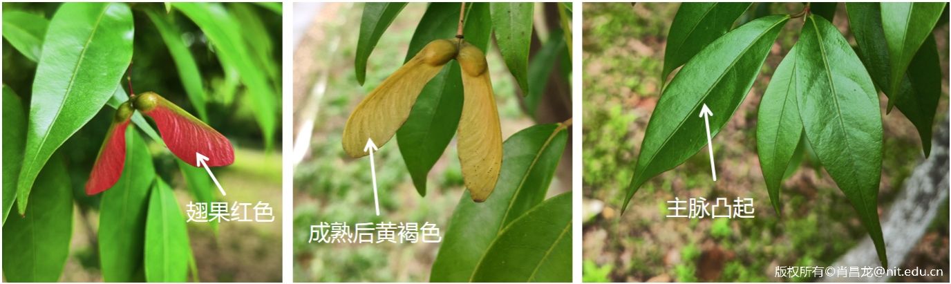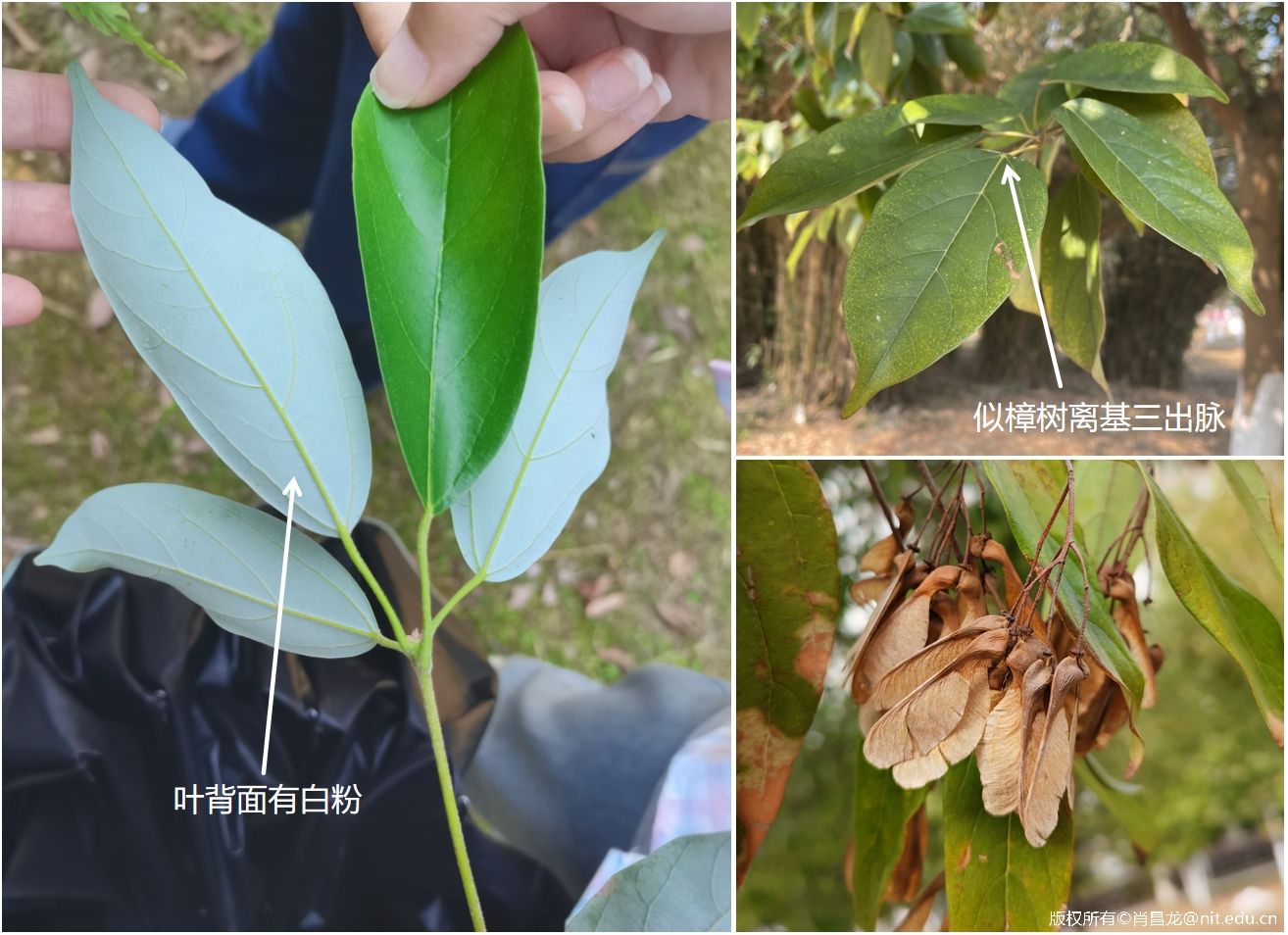 樟叶槭别名桂叶槭、革叶槭,叶革质,其叶片与樟树十分相似。常绿乔木,高10~20 m。树皮粗糙。叶革质,长圆状披针形或披针形,全缘;上面绿色,无毛,下面被淡黄褐色绒毛,常有白粉;侧脉4~6对;叶柄淡紫色,嫩时有绒毛。伞房状花序,雄花与两性花同株;萼片淡绿色,长圆形,花瓣淡黄色,倒卵形,雄蕊长于花瓣。翅果长3~3.5 cm,果翅张开成钝角。花期3月;果期7~9月。