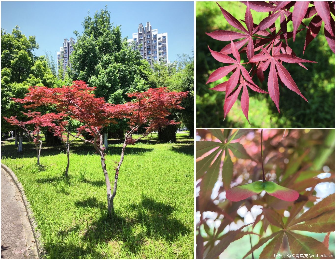 槭科园位于校园拓荒牛西南方,每到深秋,红色的枫叶挂满枝头,艳丽无比,里面有三角槭、五角槭、元宝槭、红枫、鸡爪槭、羽毛槭、茶条槭等多种槭树。这些槭树均为无患子科槭属常绿或落叶乔木,这些槭树还被称作三角枫、五角枫、元宝枫等等,因此我们把这些槭树统称为枫叶树,是园林造景中重要的中层彩叶树种。