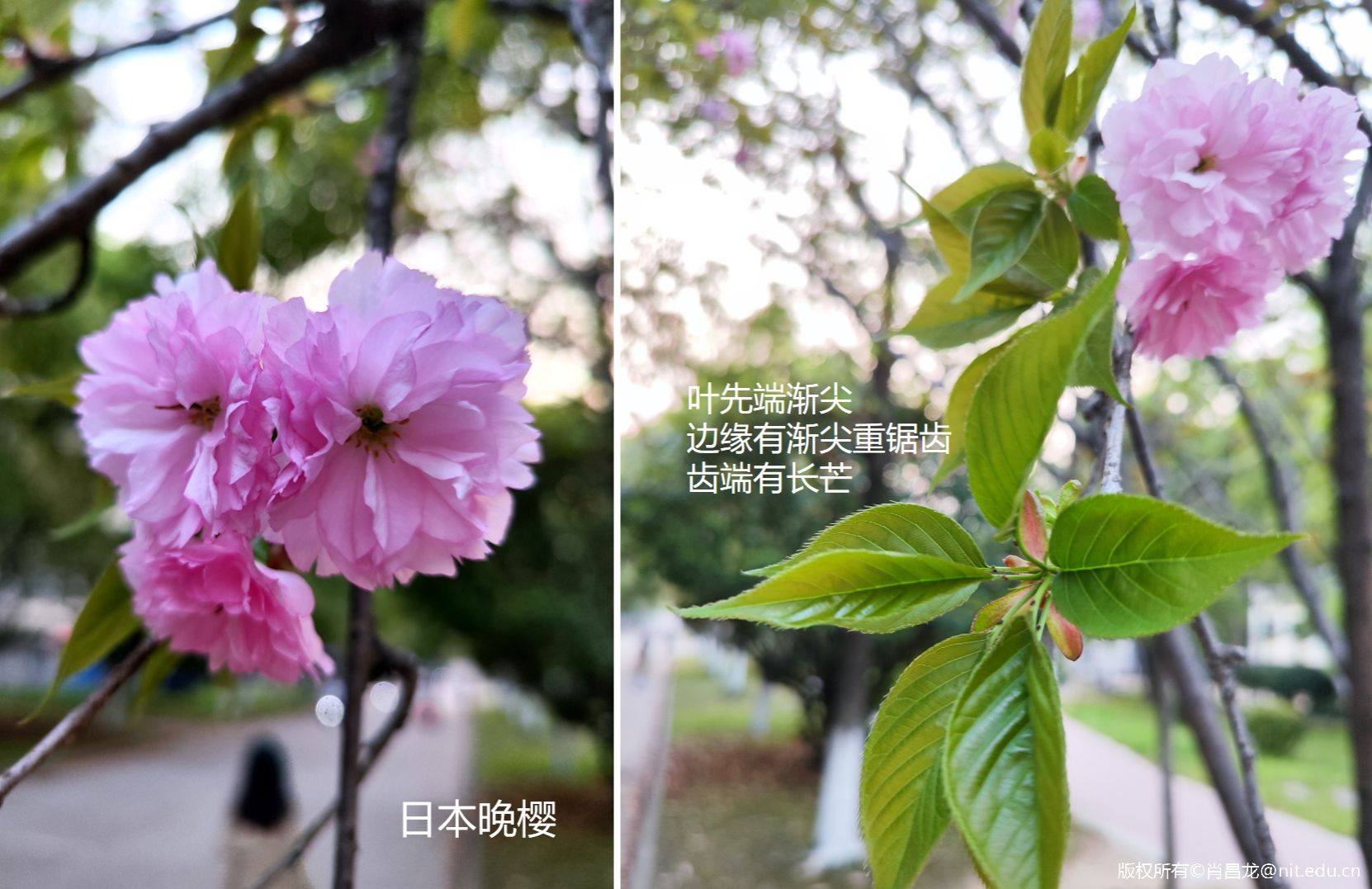 日本晚樱(Prunus serrulata var. lannesiana),花序伞房总状或近伞形,有花2-3朵,花瓣倒卵形,单瓣、半重瓣至重瓣,先端下凹,有香味。叶片椭圆形,先端渐尖,边缘有渐尖重锯齿,齿端有长芒,上面深绿色,下面淡绿色。花期3至5月,常作为行道树,在中国广泛栽植。