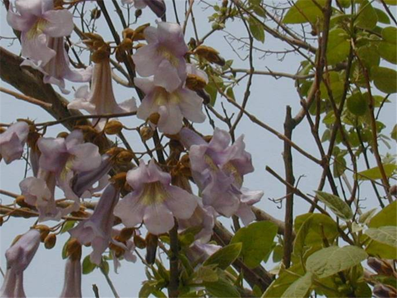 落叶乔木。树皮浅色至深灰色,幼枝密被腺毛和分枝毛。叶纸质,叶上面有毛,三角状卵形,长20—30cm,全缘或有浅裂。花序宽圆锥形花丛;花萼裂1/2或超1/2,花冠鲜紫色,有香气,管状钟形,长5—7cm,蒴果卵圆形,长3-4cm。花期4—5月,果期9月。