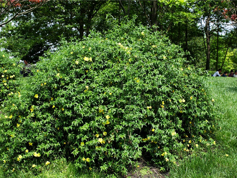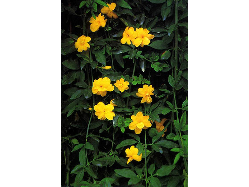 常绿灌木,枝条细长拱形,柔软下垂,绿色,四棱。3出复叶,顶端1枚较大,基部渐狭成一短柄,侧生2枚小而无柄。花单生,黄色,径约3.5~4cm,花冠裂片6或更多,半重瓣,较花冠筒长。花期4月,延续时间长。