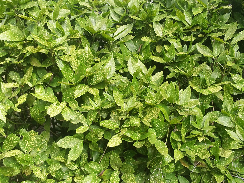 洒金桃叶珊瑚Aucuba japonicaf.variegate(山茱萸科Cornaceae) 常绿灌木。小枝粗圆,绿色无毛。叶对生,叶片椭圆状卵圆形至长椭圆形,油绿,光泽,散生大小不等的黄色或淡黄色的斑点,先端尖,边缘疏生锯齿。圆锥花序顶生,花小,紫红色或暗紫色。浆果状核果,鲜红色。花期3-4月。果熟期11月-翌年2月。