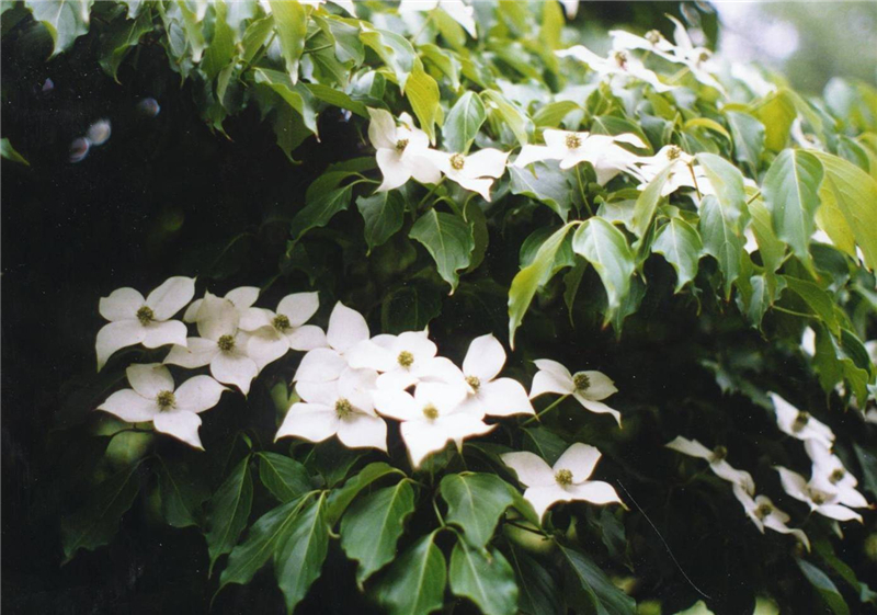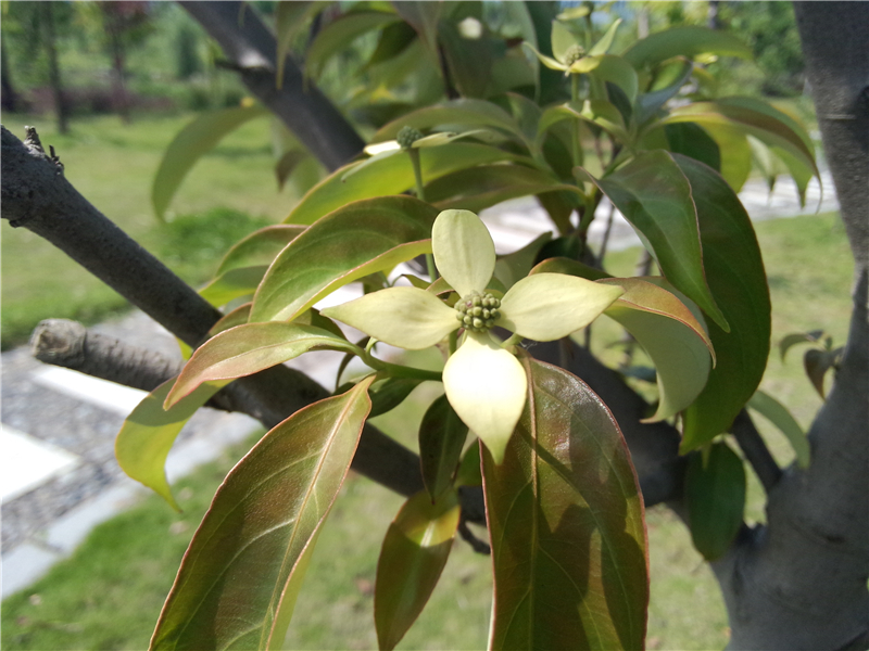香港四照花Dendrobenthamia hongkongensis(Hemsl.)Hutch. (山茱萸科Cornaceae)常绿乔木。幼枝绿色。叶对生,椭圆形、长椭圆形或倒卵状椭圆形,长6-13cm,幼时两面被白色或褐色毛,后脱落,老叶下面无毛,有褐色残点。头状花序,总苞片4,花瓣状,白色,花序具花50-70朵。果序球形,径约2.5cm。花期5-6月,果期11-12月。