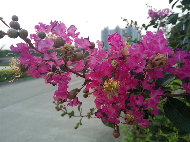 紫薇Lagerstroemia indica L. (千屈菜科Lythraceae)落叶灌木或小乔木。树皮平滑,灰色或灰褐色,枝干多扭曲。小枝四棱形,无毛。叶对生或近对生,纸质,椭圆形,长2.5—7cm,短尖或钝,有时微凹,下面脉上有毛;具短柄。顶生圆锥花序,长7—20cm;花淡红或紫色、白色,径3—4cm;花瓣6,皱缩,有长爪;萼裂片6;雄蕊36—42,外面6枚特长,着生在花萼上。果卵圆状球形或阔椭圆形,长1—1.3cm,基部有宿存花萼,6瓣裂。花期6—9月,果期9—12月。