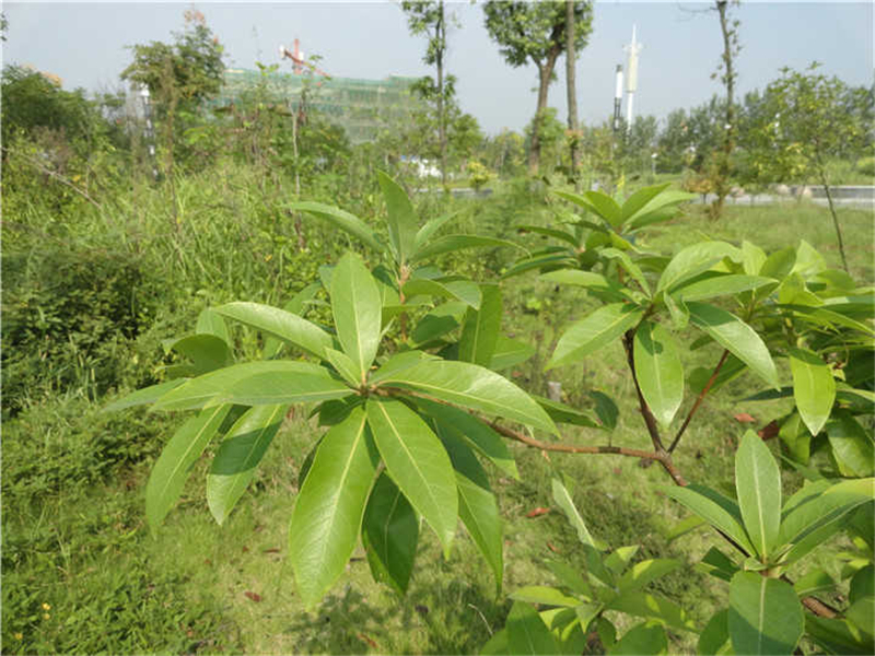 木荷Schima superba Gaertn. et Champ. (山茶科Theaceae)常绿乔木,高达30m。树皮灰褐色,纵裂。冬芽卵状圆锥形,被白色柔毛。叶革质,卵状椭圆形至长圆形,长6-15cm,短尖或渐尖,缘有疏钝齿,两面无毛;叶柄长1-2cm。花白色,单朵腋生或成短总状花序。果扁球形,径1.5-2cm,熟时5瓣裂,中轴宿存;种子肾形,扁平,周围有翅。花期3-8月,果期9-11月。