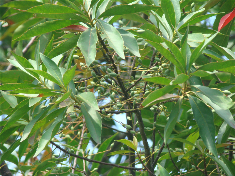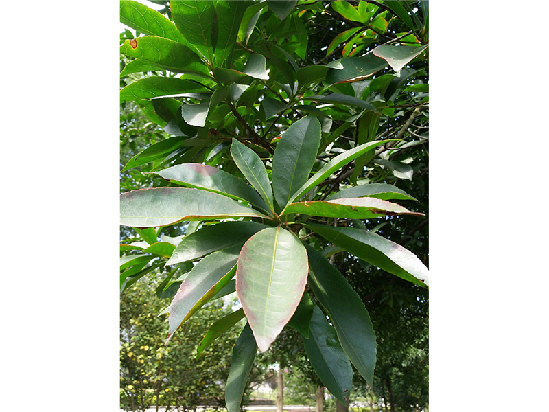 秃瓣杜英 Elaeocarpaus glabripetalus Merr. (杜英科Elaeocarpaceae)常绿乔木。一年生枝红褐色,略具条棱,无毛。叶近革质,倒披针形,长8一13cm,基部渐窄且下延,具小钝齿,侧脉6—7对;叶柄长5—7mm。总状花序生叶下部老枝上,长6—9cm;花瓣白色,先端撕裂为16—18条;雄蕊20—30,花药顶端具毛丛;花盘5裂,子房有毛。核果椭圆形,长1.2—1.5cm。花期6—7月,果期9月。