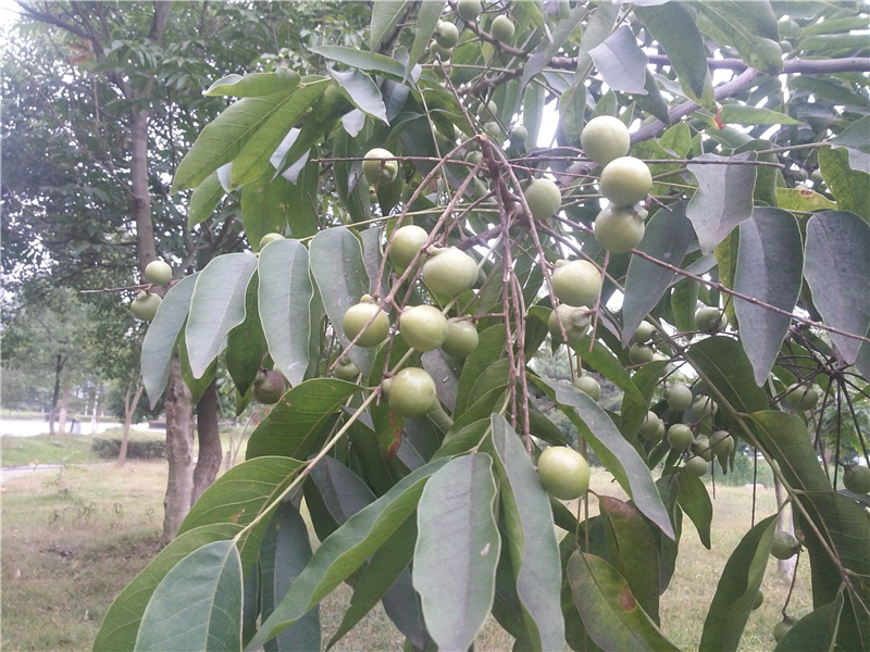 无患子Sapindus mukorossi Gaertn. (无患子科Sapindaceae)落叶或半常绿乔木,高15—20m。树皮灰白色。偶数羽状复叶,长25—40cm或更长,小叶全缘5(4—7)对,互生或近对生,卵状披针形或长圆状披针形,长8—15cm,基部偏楔形,两面无毛,网脉清晰。圆锥花序顶生,花盘杯状,花瓣5,具长爪,长2.2mm。核果,橙黄色,干时微亮;种子近球形,光滑。花期5—6月,果期10—11月。