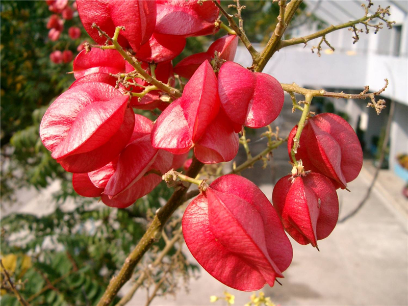 复羽叶栾树Koelreuteria bipinnata Franch. (无患子科Sapindaceae)落叶乔木,高15—20m。2回羽状复叶,长60—70cm,羽片5—10对;小叶有锯齿,下面中脉及脉腋具毛。圆锥花序长40—65cm,与花柄同被短柔毛;花黄色;花瓣4,线状披针形,具爪,上部具2枚耳状小鳞片。蒴果椭圆状卵形,具3棱,形如灯笼泡,顶端浑圆而有小凸尖,成熟时紫红色;种子球形,黑褐色,径约5mm。花期7月,果期9—10月。
