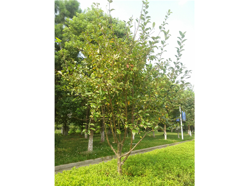 西府海棠Malus micromalus Makino (蔷薇科Rosaceae)。落叶小乔木。树冠紧抱,枝直立性强。小枝紫红色或暗紫色,幼时被短柔毛,后脱落。叶椭圆形至长椭圆形,长5—10cm,先端渐尖,基部广楔形,锯齿尖细。花序有花4—7朵,集生于小枝顶端,花淡红色,径约4cm;花梗及花萼具柔毛。果近球形,红色,萼片宿存或脱落。花期4—5月,果期9—10月。