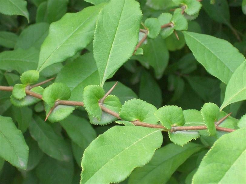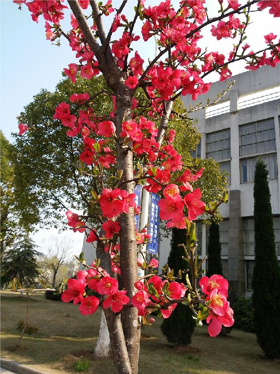 贴梗海棠Chaenomeles speciosa(Sweet)Nakai (蔷薇科Rosaceae)。落叶灌木,高达2m,有枝刺。小枝无毛。叶卵形或椭圆形,长3—9cm,具尖锯齿,下面无毛;托叶大,半圆形。花先叶开放,3—5朵簇生于2年生枝上,红色,粉红色或白色,因品种而异,径3—5cm,萼筒钟状,花梗短粗。果球形或卵球形,径3—5cm,黄色或黄绿色,果皮皱。