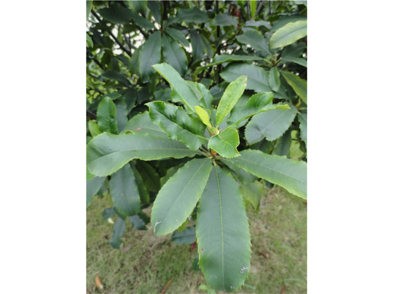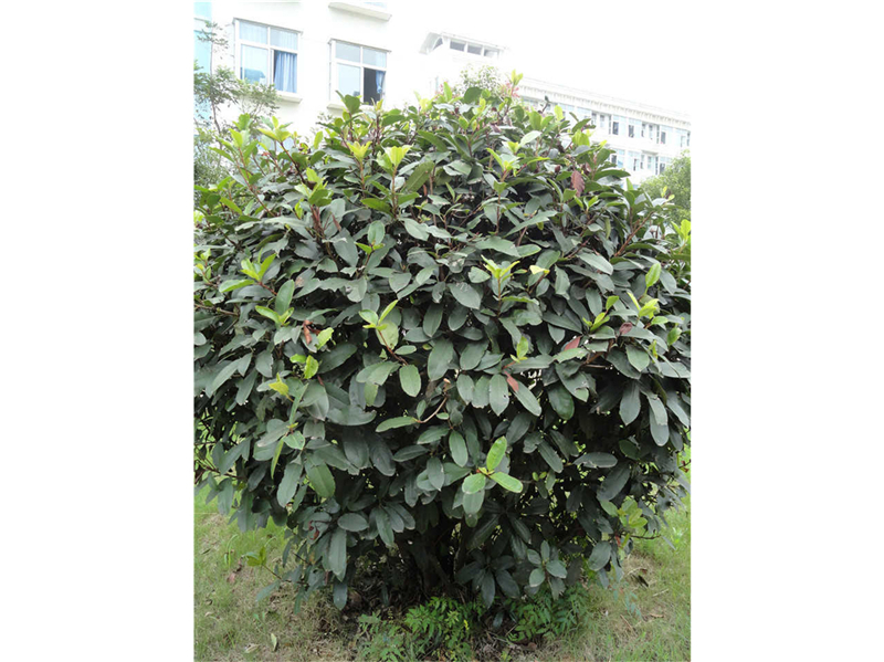 石楠Photinia serrulata Lindl. (蔷薇科Rosaceae)。常绿小乔木,高达10m。小枝无毛。叶长椭圆形或倒卵状椭圆形,长9-22cm,先端渐尖,基部圆或宽楔形,细锯齿或幼树具刺状锯齿,叶柄长2—4cm。复伞房花序,花白色。梨果近球形,径5—6mm,红色。花期5月,果期10月。