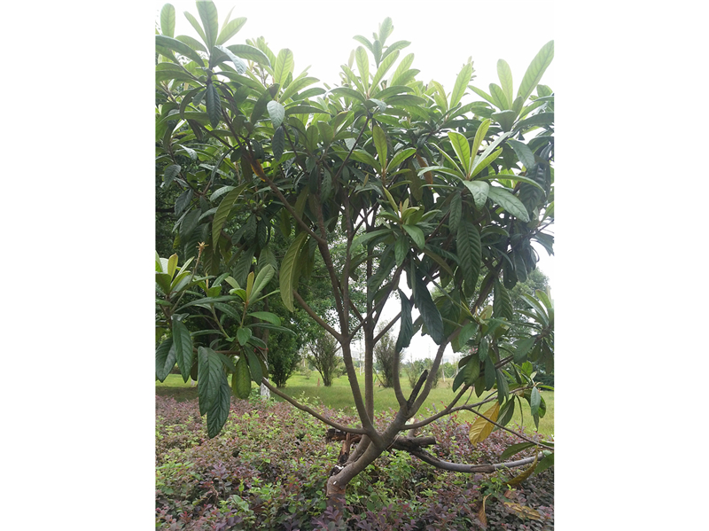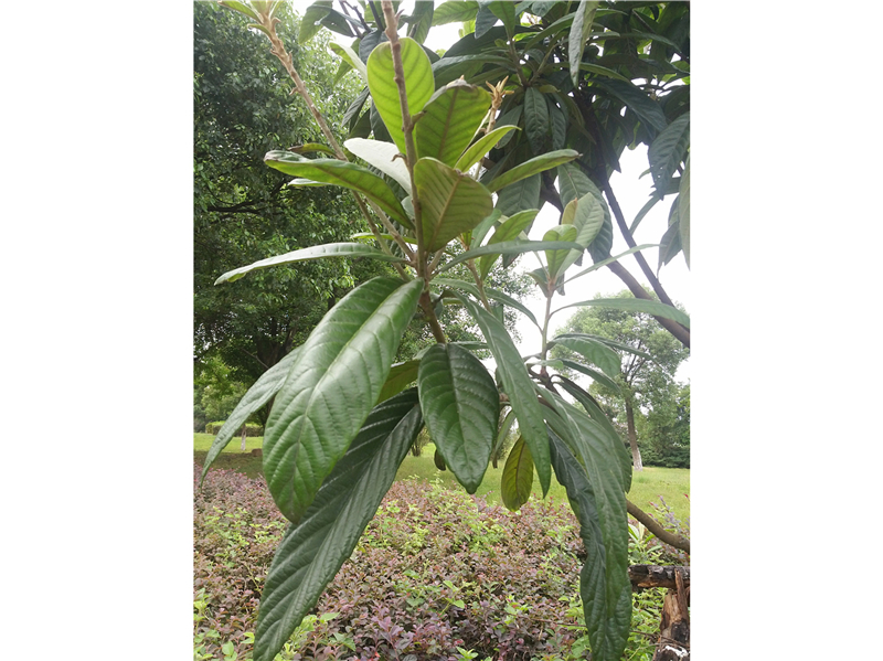 枇杷Eriobotrya japonica (Thunb.) Lindl. (蔷薇科Rosaceae)。常绿乔木,高达10m。小枝、叶下面、花序密被锈色或灰棕色绒毛。叶披针形、倒披针形或卵圆状长圆形,革质,长10—30cm,先端渐尖或急尖,基部楔形或下延至叶柄,具疏锯齿,上面多皱。总状花序,常数个集合成圆锥状,花白色。梨果球形,径2—5cm,黄色或桔黄色。花期10—12月,果期翌年4—6月。
