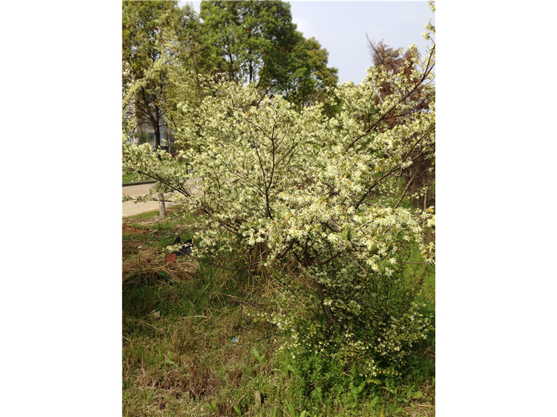 檵木Loropetalum chinense (R.Br) Oliv. (金缕梅科 Hamamelidaceae)。常绿灌木或小乔木,高2—8m。小枝有星状毛。叶卵形,长2—5cm,上面略有粗毛,下面被星状毛,先端锐尖,基部钝形,偏斜,全缘。花萼杯状,被星状毛,萼齿卵形,脱落,花瓣窄条形,长1—2cm、白色。蒴果卵圆形,长7—8mm,萼筒长为蒴果的2/3。花期4月,果期10月。