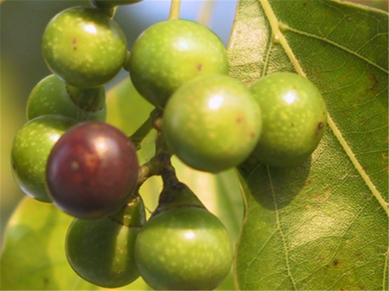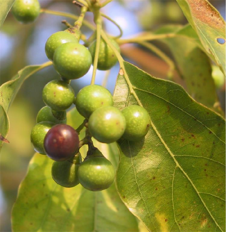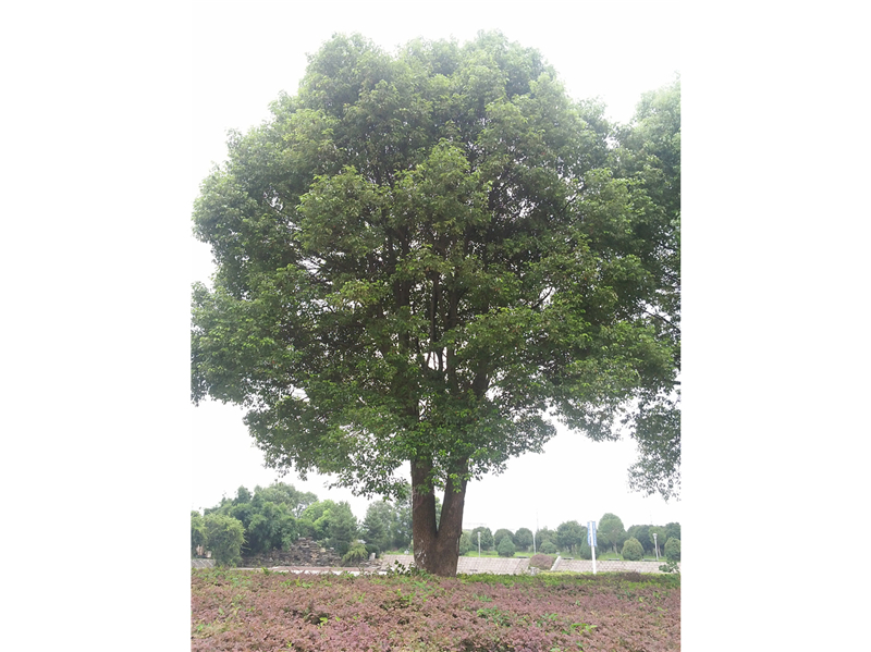 樟树 Cinnamomum camphora (L.) Presl (樟科Lauraceae)。常绿乔木,高达50m,胸径4-5m;树皮黄褐色,纵裂。小枝光绿无毛。叶互生,近革质,卵形或卵状椭圆形,长7—12m,宽3—5.5m,先端尖,基部楔形或椭圆,缘波状,光绿,下面微有白粉,离基三出脉,脉腋有腺体;叶柄长2—3cm。花序长4—7cm;花黄绿色,径6mm,果球形,径6—8mm,熟时紫黑色;果托杯状,果梗不增粗。花期4-5月,果期9-11月。