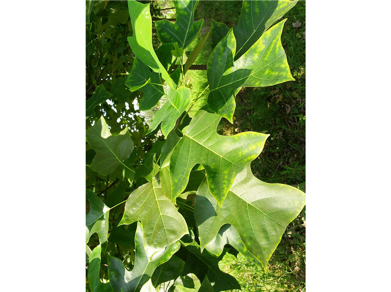 鹅掌楸Liriodendron chinense Sarg. (木兰科Magnoliaceae)。落叶乔木,高达40 m,胸径1m。树皮灰白色。小枝具环状托叶痕。单叶互生,叶马褂状,长6—14 cm,先端缺裂,两侧各具1裂片。花冠杯状,花被片9,外轮3片萼片状,内轮6片倒卵形,长3—3.5cm,黄绿色有深黄色条纹;雌蕊群伸出雄蕊群之上。聚合果长7—9cm,小坚果长6mm,翅长2—3cm,翅顶端钝或钝尖。花期5月,果期9—10月。