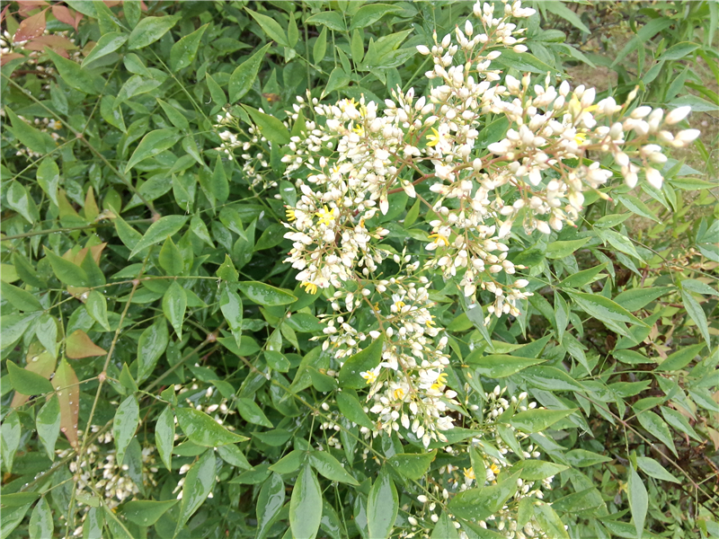 南天竹Nandina domestica Thund. (小檗科Berberidaceae)常绿灌木,高约2cm;丛生状,茎干直立,无毛,幼枝常为红色。3-4回羽状复叶,叶长30~50cm,基部常有褐色抱茎的鞘,小叶近无柄,革质,椭圆状披针形,长3~7cm,先端渐尖,基部楔形,两面光滑无毛。花序顶生,直立,长20~35cm,花小而多,白色。果球形,成熟时鲜红色,径约8mm,含2种子。花期5~7月,果期9~10月。