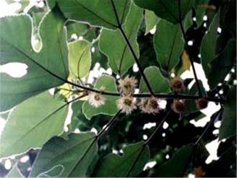 构树Broussonetia papyrifera (L.) L’Herit. ex Vent. (桑科Moraceae)落叶乔木,高达16m,胸径60cm。小枝粗壮,密被灰色绒毛。叶互生,常在枝端对生,宽卵形,长7—18cm,宽4—10cm,先端渐尖,基部圆或近心形,不裂或2—3裂,上面有糙伏毛,下面被软柔毛;叶柄长2.5—8cm,有密毛;托叶三角形,膜质,大而早落。雌雄异株,雄花序为柔荑花序,雌花序为头状花序。聚花果球形,径约3cm,橙红色。花期5月,果期8—9月。