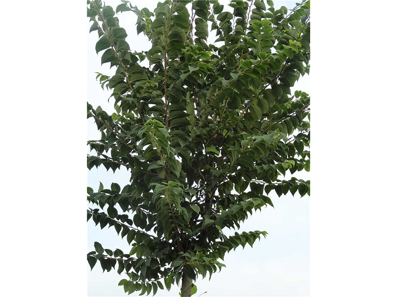珊瑚朴Celtis julianae Schneid. (榆科Ulmaceae)落叶乔木,高达30m,胸径1m。小枝、叶下面及叶柄密被褐黄色绒毛。叶宽卵形、卵状椭圆形,长6-10(12)cm,宽3.3-7cm,先端短渐尖或突短尖,基部近圆形,中部以上有钝锯齿,上面稍粗糙;叶柄长5-15mm。果单生叶腋,卵球形,长1-1.5cm,橙黄色,果梗长1.5-2.5cm,密被绒毛;果核顶部具长2mm的尖头,有2肋,表面呈不明显的网纹及凹陷。