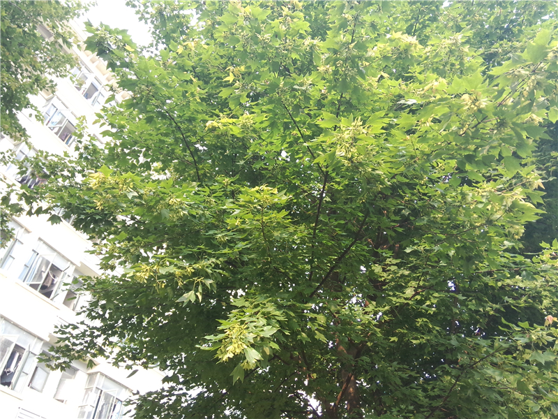 三角槭(三角枫)Acer buergerianum Miq.(槭树科Aceraceae)落叶乔木,高5-10m。树皮长条状薄片剥落。叶对生,近革质,椭圆形或倒卵形,长4—10cm,先端3浅裂(至1/4),裂片前伸,近等大,全缘,稀不裂或深裂(幼树之叶),下面被白粉或细毛,沿脉较密,基部近圆形或楔形,3出脉;叶柄长2.5—7cm。伞房花序顶生,被柔毛。翅果之小坚果显著凸起,连同翅长2—2.5cm,张开成锐角。