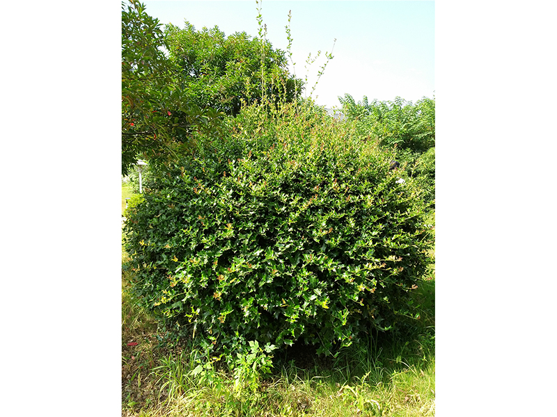 枸骨Ilex cornuta Lindl. et Paxt. (冬青科Aquifoliaceae)常绿灌木或小乔木,高1—3m,最高可达10 m。树皮灰白色,光滑。叶硬革质,四方状长圆形或卵形,长4—7cm,先端具3个硬刺,两侧有1—2对锐刺,大树之叶有时近全缘,上面亮绿色,下面淡绿色。花序簇生于二年生枝叶腋;花黄绿色,4数。果球形,鲜红色,径8—10mm;分核4。花期4-5月,果期9-10。