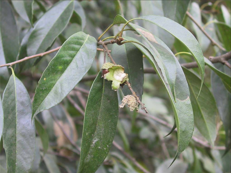 苦槠Castanopsis sclerophylla(Lindl.) Schott. (壳斗科Fagaceae)常绿乔木,高达15m,胸径50cm;树皮暗褐色,浅纵裂。叶厚革质,长椭圆形或卵状椭圆形,长7—15cm,宽3—5.5cm,短渐尖,边缘中部以上有粗锐齿,下面有淡银灰色蜡层,侧脉10—14对;叶柄长1.5—2.5cm。壳斗深杯状,全包或包坚果大部分,径1.2—1.5cm,苞片鳞片状,鳞片三角形或瘤状突起,坚果近球形,径1—1.4cm,果脐径7—9mm。花期4—5月,果期9—11月。