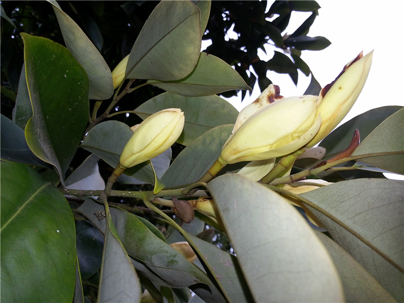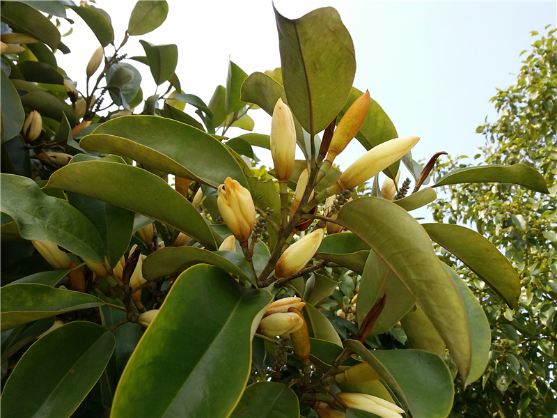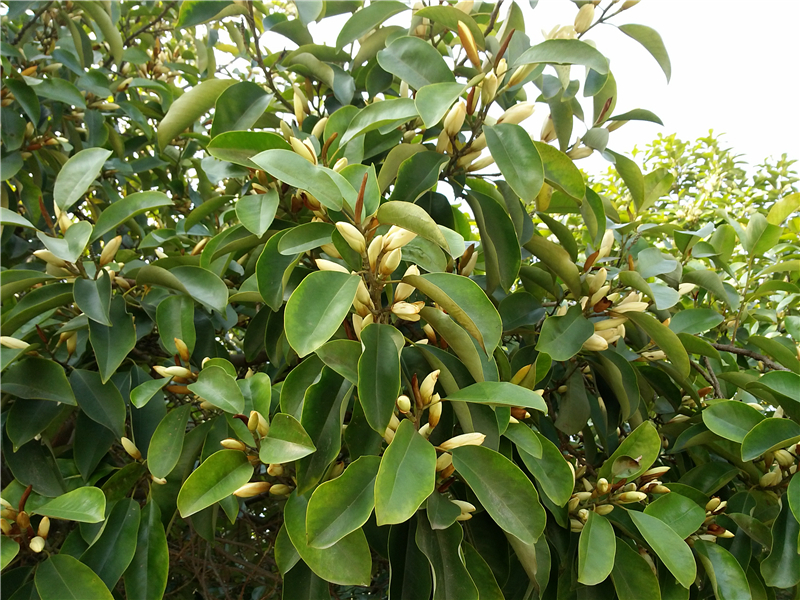 醉香含笑Michelia macclurei Dandy (木兰科Magnoliaceae)。常绿乔木,高达30 m。芽、嫩枝、叶柄、托叶及花梗均被红褐色绢毛。叶革质,倒卵形或倒卵状椭圆形,中部以上最宽,长7—13 cm,宽4—6 cm,先端短急尖,基部宽楔形,下面被灰色杂有褐色平伏短柔毛,侧脉10—15对,网脉呈蜂窝状;叶柄长2.5—4 cm,无托叶痕。花白色,花被片9,花梗粗。聚合果长3—7cm,蓇葖3—10。花期4-5月,果期9-10月。