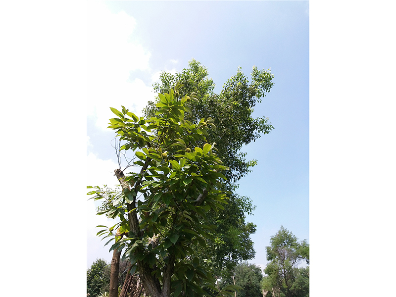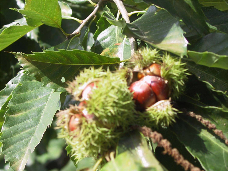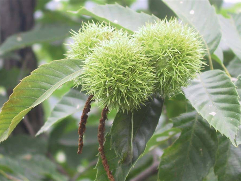 板栗 Castanea mollissima Bl. (壳斗科Fagaceae)落叶乔木,高达15m,胸径达lm,树皮灰褐色,深纵裂。叶长椭圆形,长9—18cm,宽4—7cm,有锯齿,齿端具芒尖,下面密被灰白至灰黄色短柔毛,侧脉10—18对;叶柄长0.5—2cm;托叶窄三角形。雌雄花同序,花序长9—20cm;雄花生花序中上部,雌花生于基部,2—3(5)花生于总苞内。壳斗连刺径4—6.5cm,密被灰白色星状毛,刺长而密,每壳斗有坚果2—3;坚果扁圆形,径1.6—3cm,暗褐色,顶部有绒毛。花期4—6月,果期9—10月。