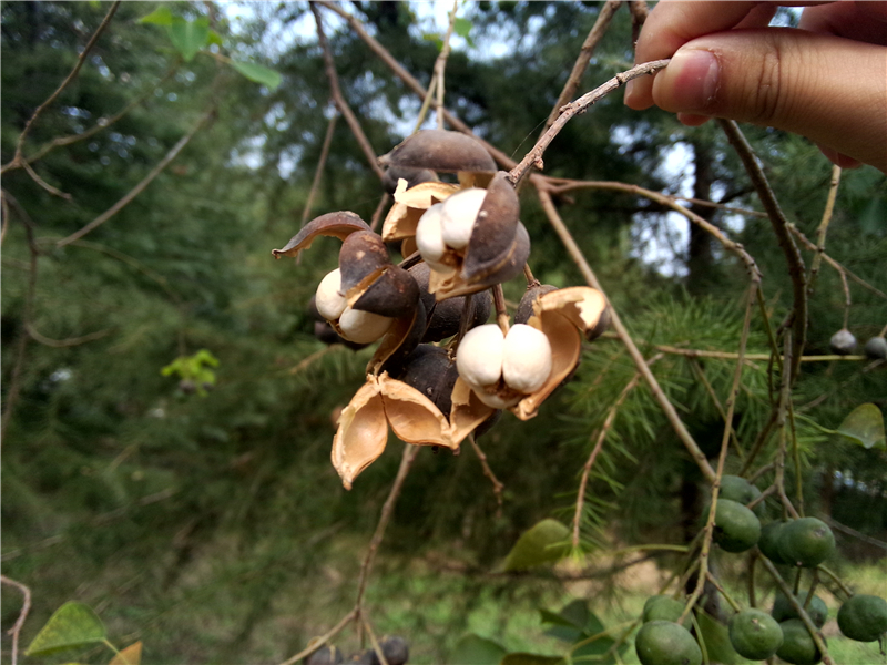 乌桕 Sapium sebiferum(L.)Roxb. (大戟科)落叶乔木,高达15m。树皮暗灰色。小枝细。叶菱状卵形,长5—9cm,先端尾状长渐尖,基部宽楔形,秋季落叶前常变为红色。花序长5—10cm;花黄绿色。果扁球形,径1.5cm,熟时黑褐色,3裂;种子黑色,外披白蜡,固着于中轴上,经冬不落。花期4—7月,果期10—11月。