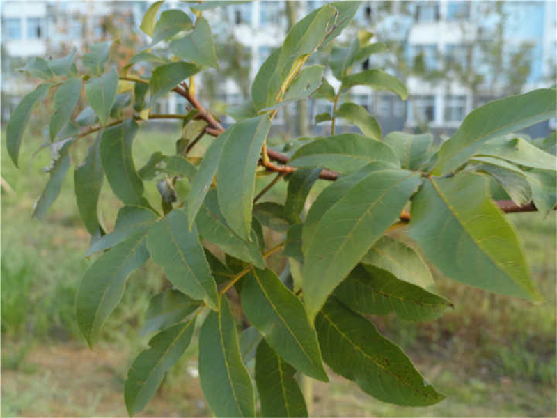 青钱柳 Cyclocarya paliurus (Batal.) Iljinsk. (胡桃科Juglandaceae)落叶乔木。高达20m,胸径80cm。小枝具髓心片状分割。裸芽被褐色腺鳞,具柄。叶轴被白色弯曲毛及褐色腺鳞;小叶7—9(13),椭圆形或长椭圆状披针形,长3—14cm,具细锯齿,先端渐尖,基部偏斜,两面均被腺鳞。葇荑花序,雄花序3条生花序梗上,雌花序顶生。坚果扁球形,具圆盘翅,径2.5—6cm,顶端具宿存花柱及花被片。