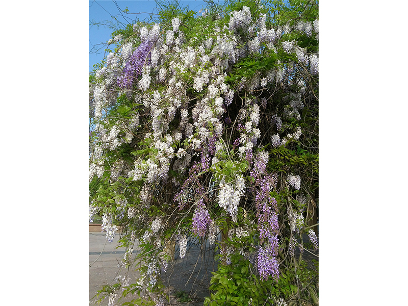 紫藤 Wisteria sinensis Sweet (蝶形花科Fabaceae)落叶大藤本。小枝被柔毛。奇数羽状复叶,互生,小叶7-13,全缘,卵形、长圆形或卵状披针形,长4.5—11cm,先端渐尖,基部圆或宽楔形,幼时两面被平状柔毛,老则近无毛。总状花序长15—30cm,花冠紫色或紫堇色,长约2.5-4cm。荚果长10—15cm,具喙,木质,密被黄色绒毛。花期4—5月,果期9—10月。