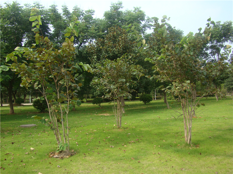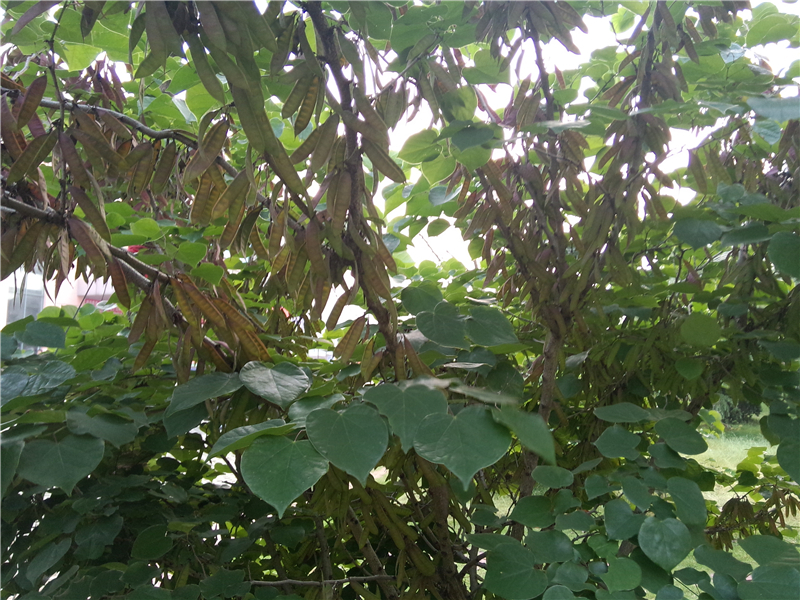 紫荆 Cercis chinensis Bunge(苏木科Caesalpiniaceae)落叶灌木或小乔木,高2—4m。叶近圆形,长6—13cm,先端骤尖,基部心形,掌状脉5。先叶开花,花5—8簇生,紫红色。果长条形,长4—8cm,腹缝具窄翅。花期3—4月,果期9—10月。
