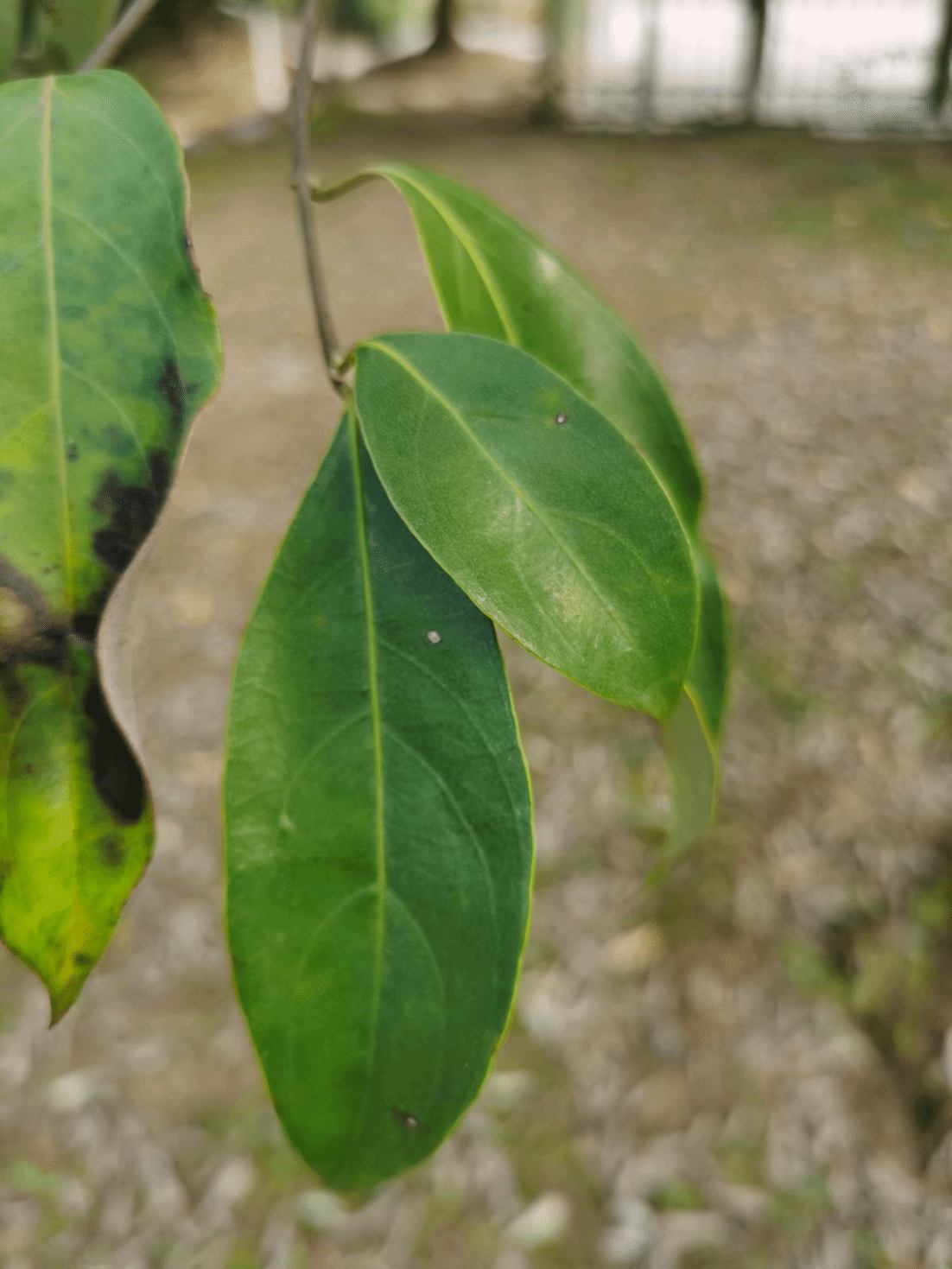 叶:叶对生,纸质,卵形、卵状椭圆形或椭圆形,先端急尖为尾状,基部圆形,表面绿色,背面粉绿色,叶脉羽状弧形上弯;
