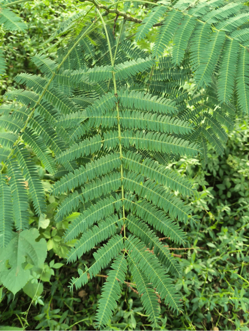 叶:托叶线状披针形,较小叶小,早落;二回羽状复叶,总叶柄近基部及最顶一对羽片着生处各有1腺体;羽片4-12对(栽培的可达20对);小叶10-30对,线形或长圆形,长0.6-1.2厘米,向上偏斜,先端有小尖头,具缘毛,有时下面沿中脉被短柔毛;中脉紧靠上缘;