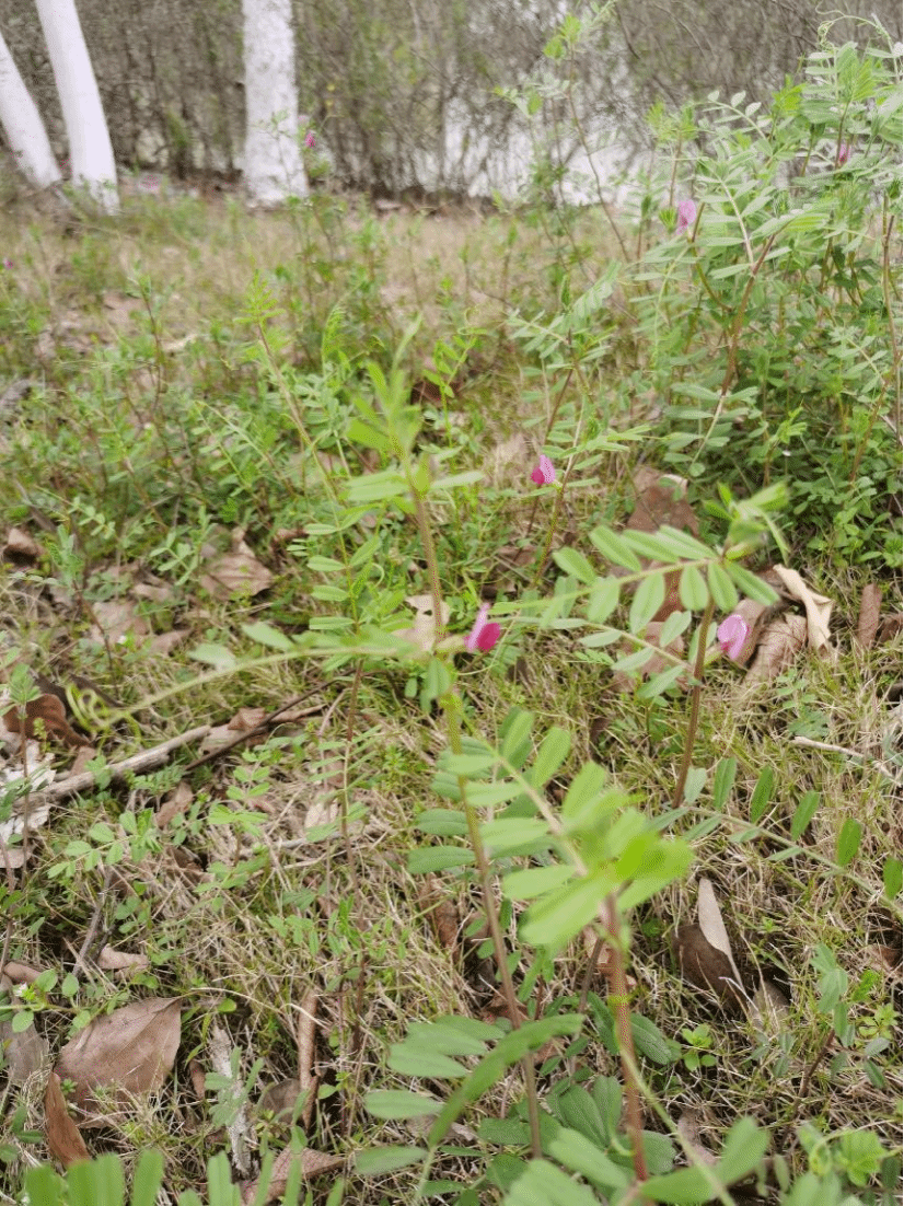 花:总状花序腋生,通常具5-8朵几无柄而密生的花,在植株下部的花单生或成对生于叶腋;花萼钟状,长4-6毫米,密被长硬毛,裂片披针形,上方2裂合生至中部以下,其余的分离;花冠紫、淡紫或白色,长4.5-8(-10)毫米,旗瓣倒卵圆形,反折,翼瓣长圆形,短于旗瓣,龙骨瓣斜倒卵形,短于翼瓣;子房被毛,基部具明显的腺体;