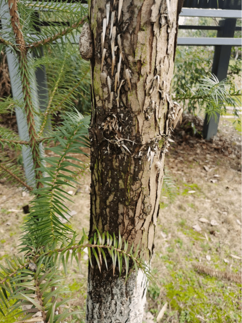 茎:树皮灰褐色,裂成长条片,内皮淡红色;大枝平展;