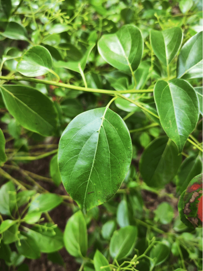 叶:叶互生,通常为椭圆状卵形或长椭圆状卵形,长6-12厘米,宽3-6厘米,在花枝上的稍小,先端通常急尖或短渐尖,基部楔形或阔楔形,革质,上面深绿色,下面色稍浅,两面无毛或仅下面腺窝具毛簇,羽状脉,侧脉每边4-5条,与中脉两面明显,侧脉脉腋上面不明显凸起下面无明显的腺窝,细脉和小脉网状;叶柄长1.5-3厘米,腹凹背凸,无毛;
