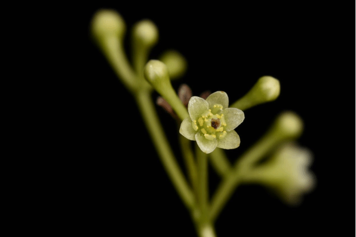 花:圆锥花序于枝条上部腋生或近顶生,长4.5-8厘米,总梗长3-5.5厘米,与各级序轴及花梗无毛;花小,长约3毫米,绿带黄色;花梗纤细,长达4毫米;