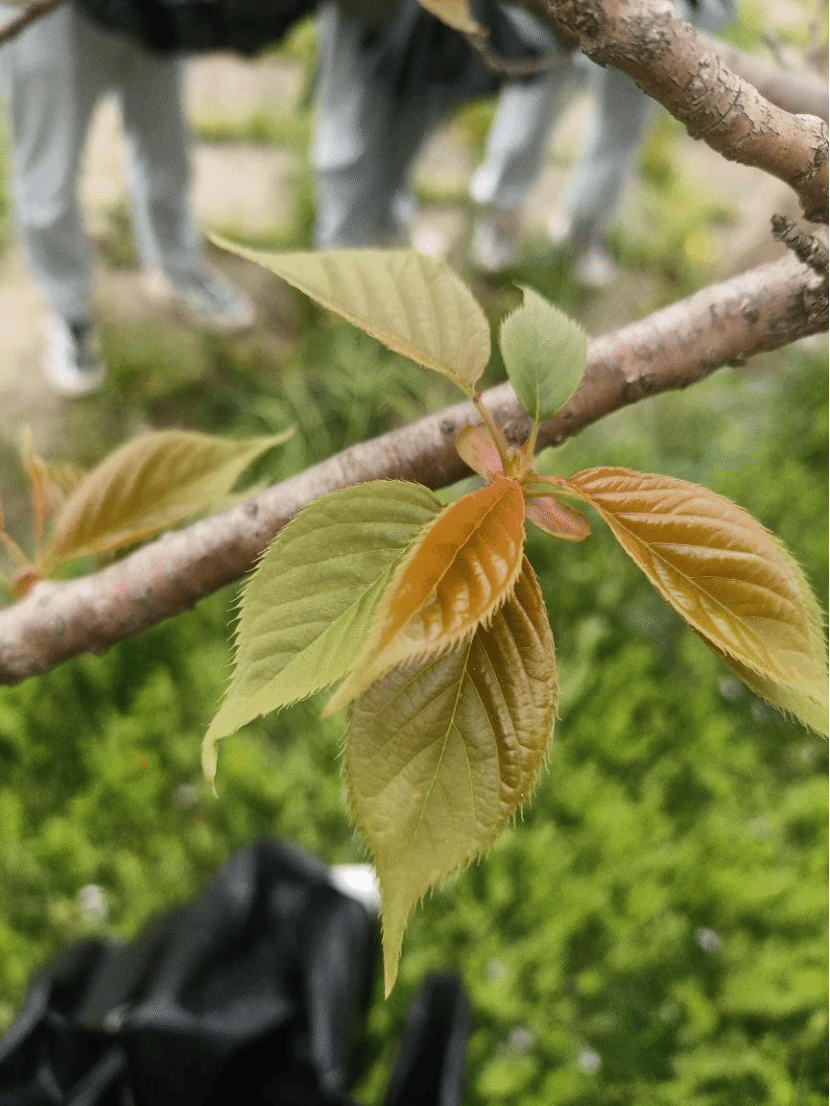 叶:叶片卵状椭圆形或倒卵椭圆形,长5-9厘米,宽2.5-5厘米,先端渐尖,基部圆形,边缘有渐尖重锯齿,齿端有长芒,上面深绿色,无毛,下面淡绿色,无毛,有侧脉6-8对;叶柄长1-1.5厘米,无毛,先端有1-3圆形腺体;托叶线形,长5-8毫米,边有腺齿,早落。
