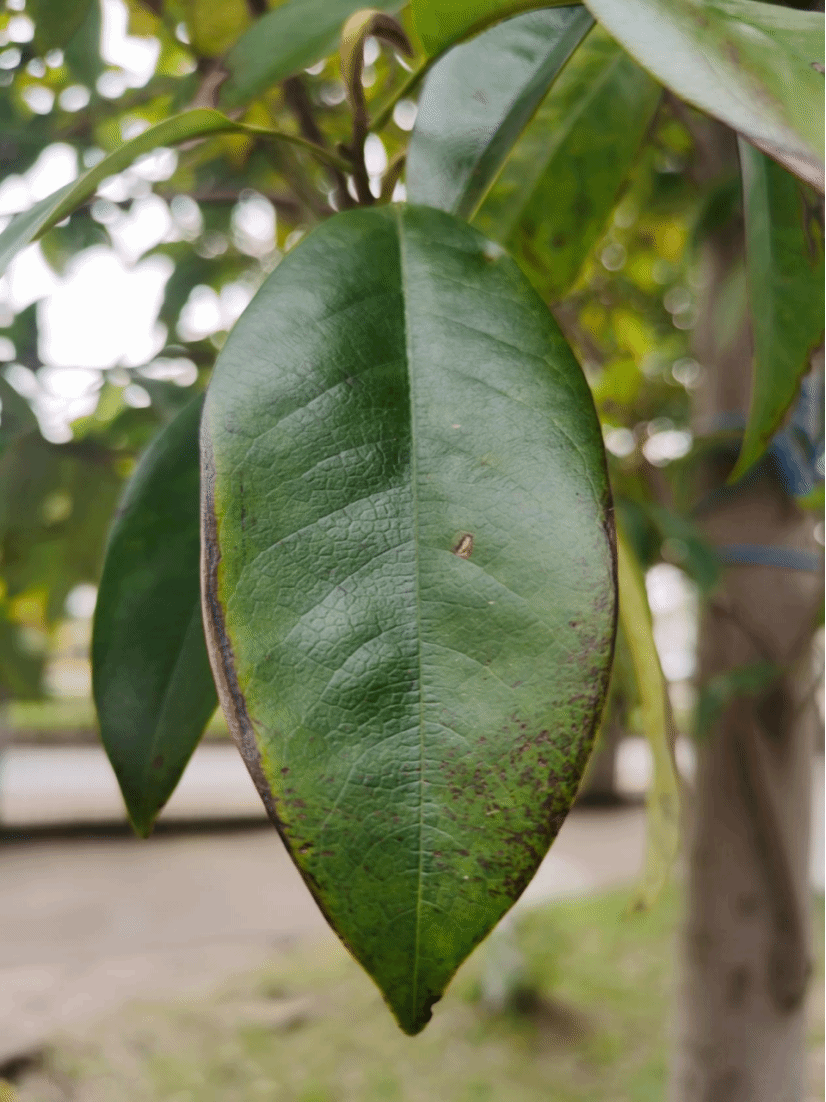 叶:叶薄革质,倒卵形、窄倒卵形或长圆状倒卵形,长6.5-16厘米,先端短尾尖或短渐钝尖,基部楔形或宽楔形,上面深绿色,有光泽;叶柄长1.5-2.5厘米,无托叶痕,上面具沟;
