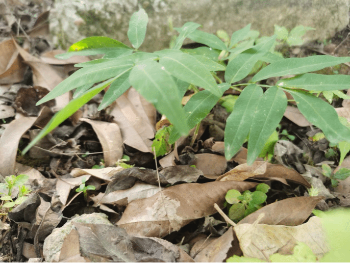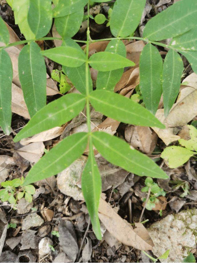 叶: 叶有小叶7-11片,很少5片或更多,小叶斜卵状披针形,通常长6-10厘米,宽2.5-4厘米,少有更大的,两则明显不对称,油点不显或甚稀少且细小,在放大镜下隐约可见,叶背灰绿色,干后略呈苍灰色,叶缘有细钝齿或全缘,无毛;小叶柄长1-1.5厘米,很少短至6毫米或长达2厘米。