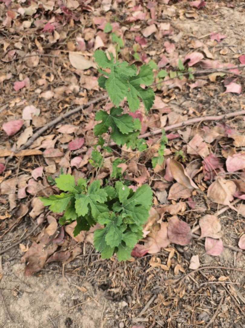 叶:叶纸质,肾状五角形,掌状5-7深裂,稀3裂,长宽均7-10厘米,基部心形,上面疏被糙伏毛,下面被柔毛及黄色腺体,裂片卵状三角形,具锯齿;叶柄长5-10厘米;
