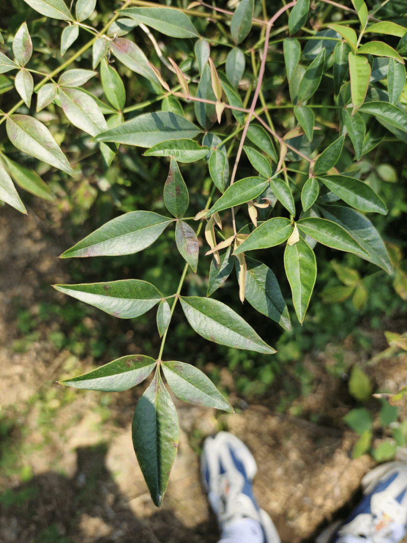 叶:叶互生,集生于茎的上部,三回羽状复叶,长30-50厘米;二至三回羽片对生;小叶薄革质,椭圆形或椭圆状披针形,长2-10厘米,宽0.5-2厘米,顶端渐尖,基部楔形,全缘,上面深绿色,冬季变红色,背面叶脉隆起,两面无毛;近无柄;