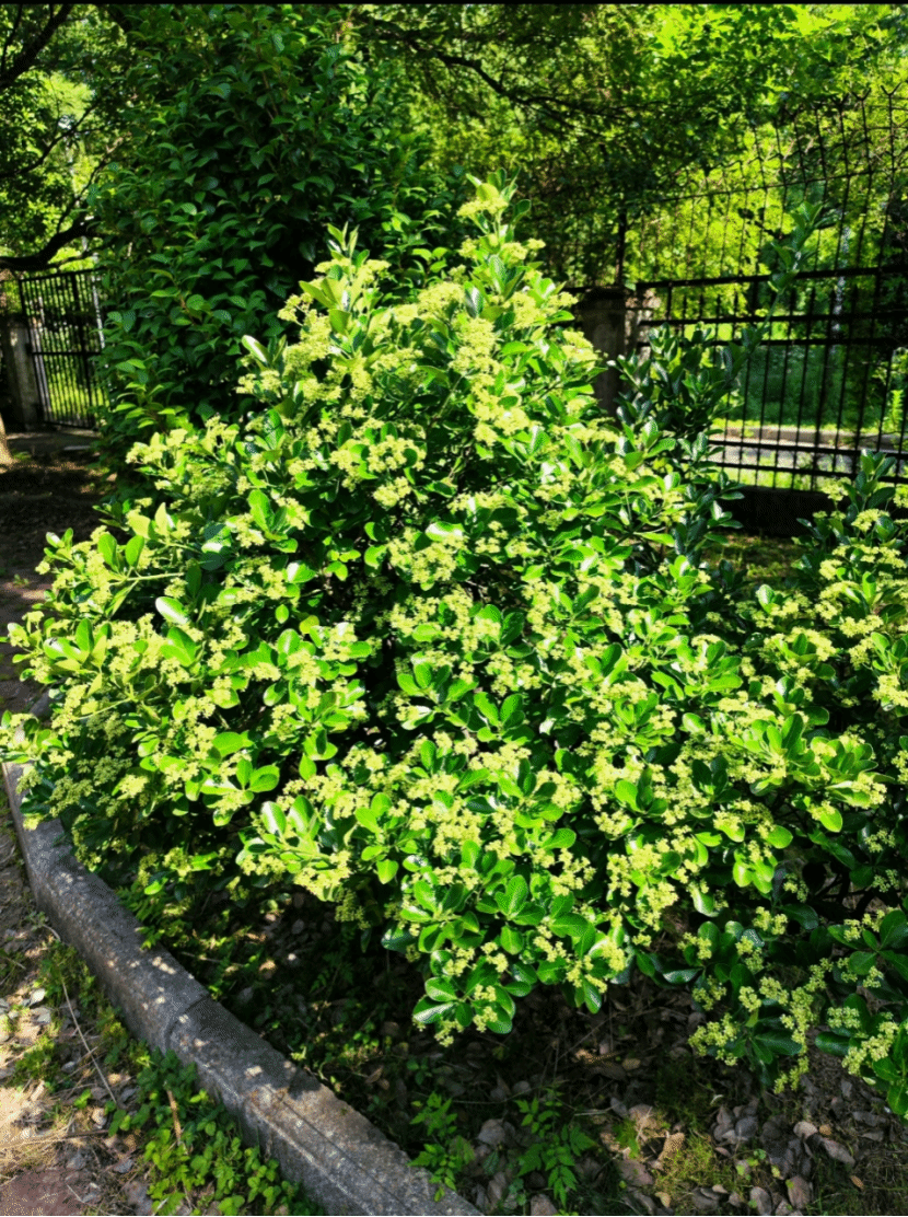 花:聚伞花序2-3次分枝,具5-12花;花序梗长2-5厘米;花白绿色,径5-7毫米;花萼裂片半圆形;花瓣近卵圆形;花盘肥大,径约3毫米;花丝长1.5-4毫米,常弯曲;子房每室2胚珠,着生中轴顶部;