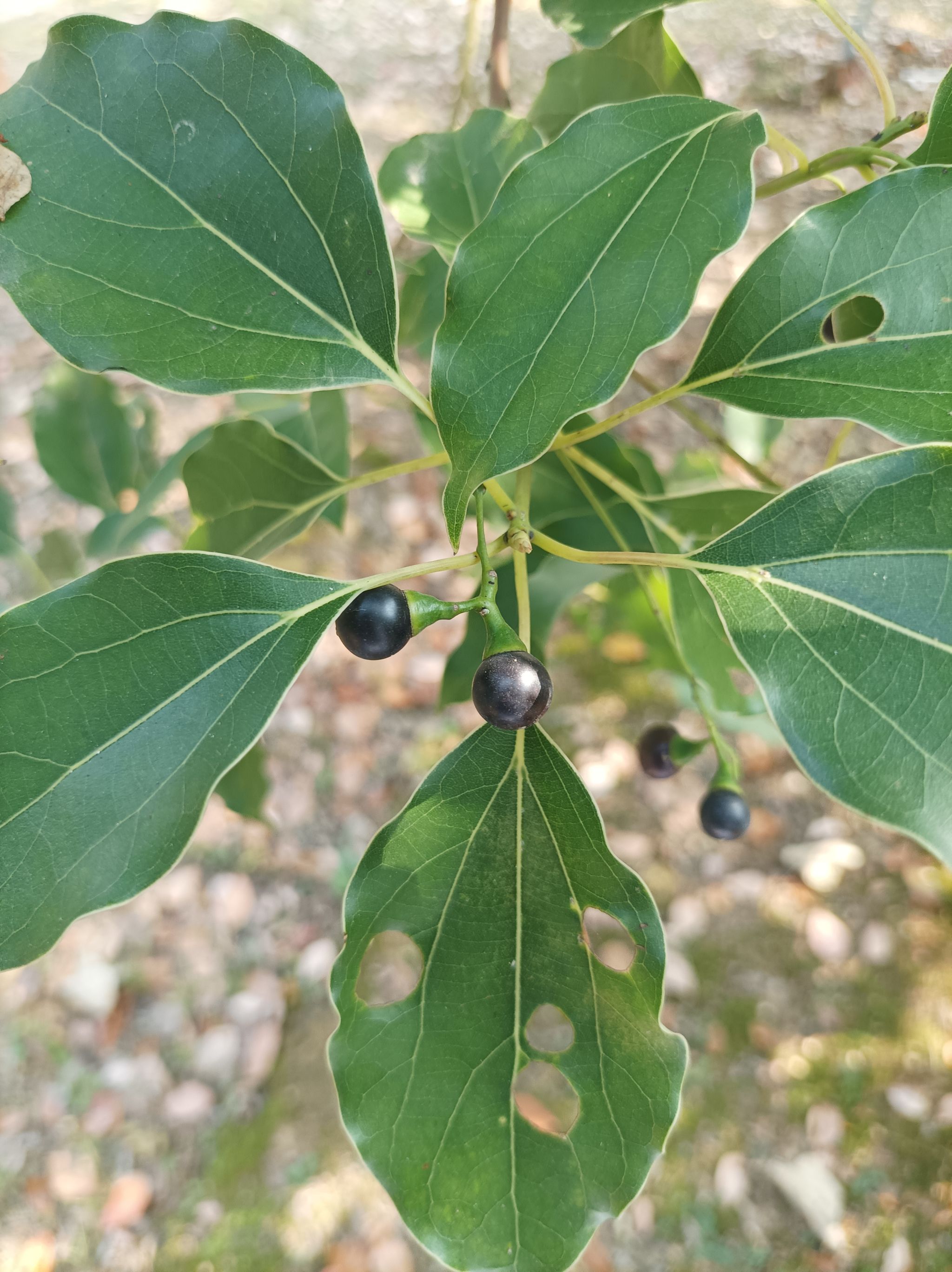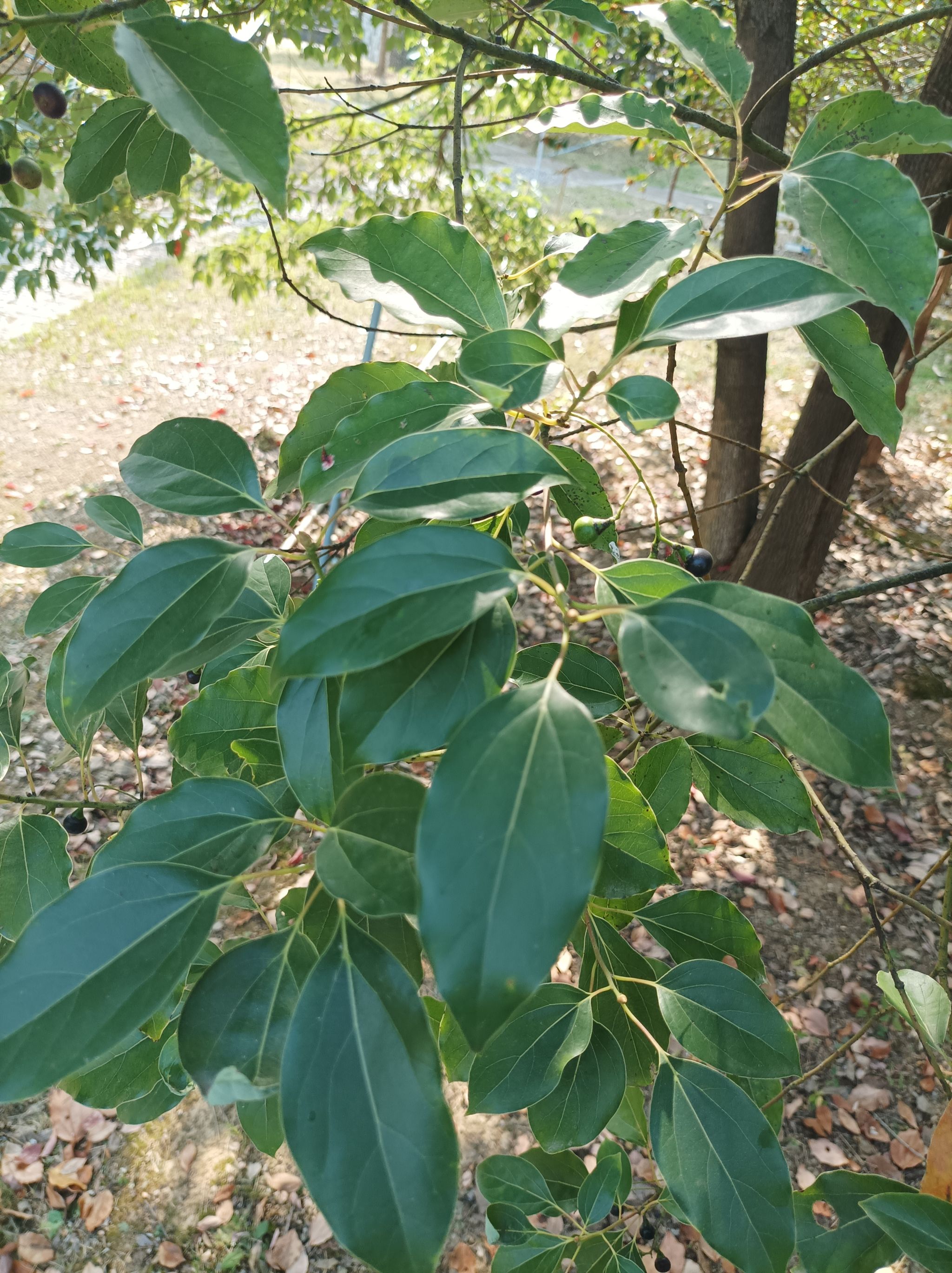 叶:叶卵状长圆形或长圆状披针形,长7-10厘米,先端尖或渐尖,基部宽楔形或近圆,两面无毛,离基三出脉;叶柄长达1.5厘米,带红褐色,无毛;
