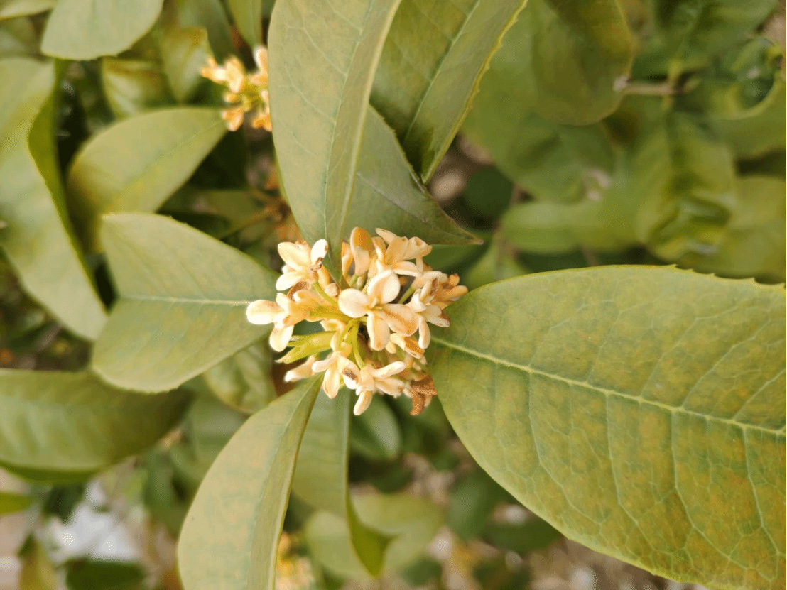 花:聚伞花序簇生于叶腋,或近于帚状,每腋内有花多朵;苞片宽卵形,质厚,长2-4毫米,具小尖头,无毛;花梗细弱,长4-10毫米,无毛;花极芳香;花萼长约1毫米,裂片稍不整齐;花冠黄白色、淡黄色、黄色或桔红色,长3-4毫米,花冠管仅长0.5-1毫米;雄蕊着生于花冠管中部,花丝极短,长约0.5毫米,花药长约1毫米,药隔在花药先端稍延伸呈不明显的小尖头;雌蕊长约1.5毫米,花柱长约0.5毫米。