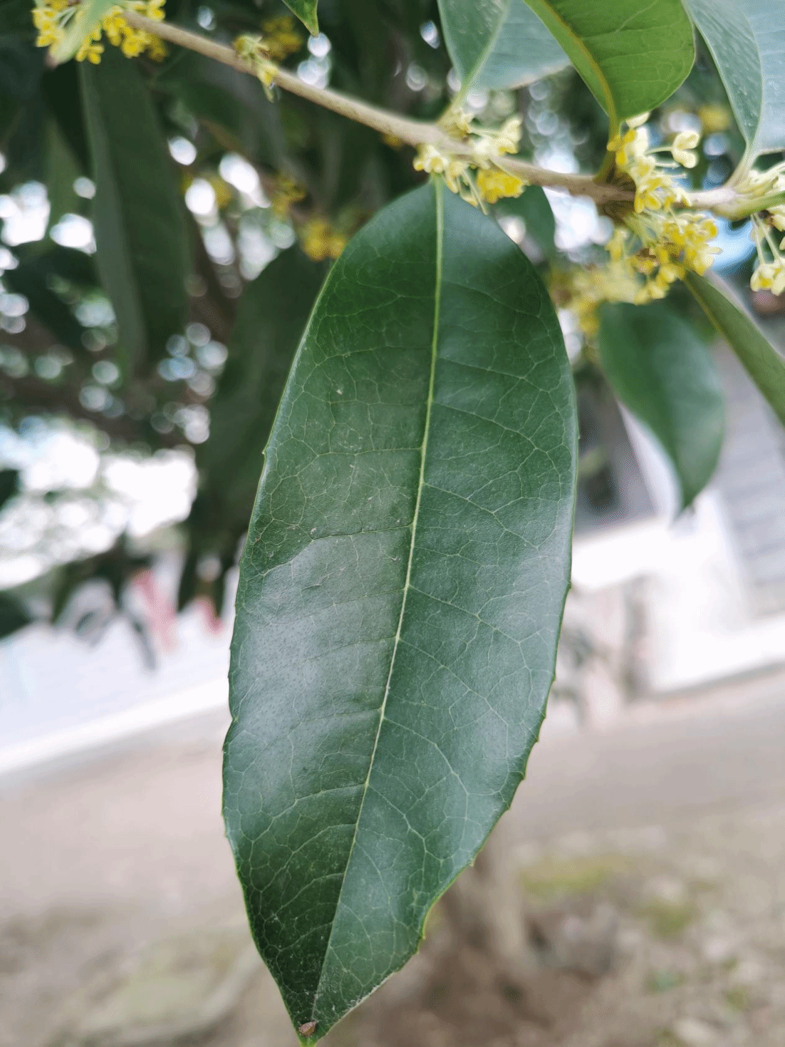 叶:叶片革质,椭圆形、长椭圆形或椭圆状披针形,长7-14.5厘米,宽2.6-4.5厘米,先端渐尖,基部渐狭呈楔形或宽楔形,全缘或通常上半部具细锯齿,两面无毛,腺点在两面连成小水泡状突起,中脉在上面凹入,下面凸起,侧脉6-8对,多达10对,在上面凹入,下面凸起;叶柄长0.8-1.2厘米,最长可达15厘米,无毛。